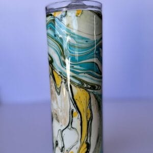 You can find ocean blue, hunter green, a pop of yellow, and a trace of rose gold on this tumbler. Take your favorite beverage with you on the go and it will stay extra icy in our stainless steel tumbler.