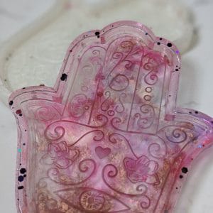 This hand-poured resin Hamsa Hand trinket tray measures roughly 4″x4.5″ and is a perfect catch-all tray for your favorite pieces of jewelry, chapsticks or keys. We’ve even had customers use it as a charging station for their crystals. We used a combination of pink and copper colorants that really come alive when the sun hits on this one-of-a-kind tray.